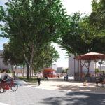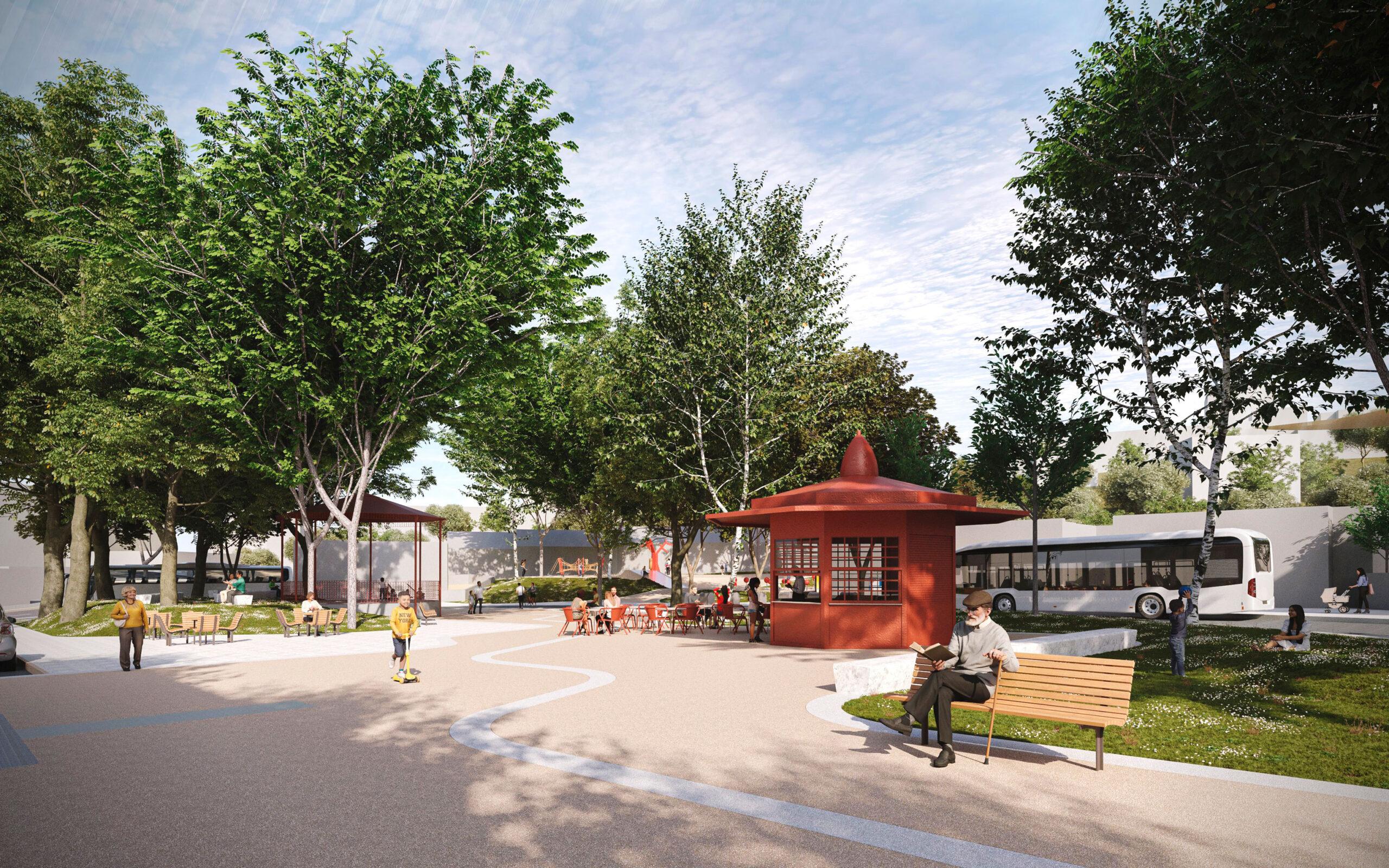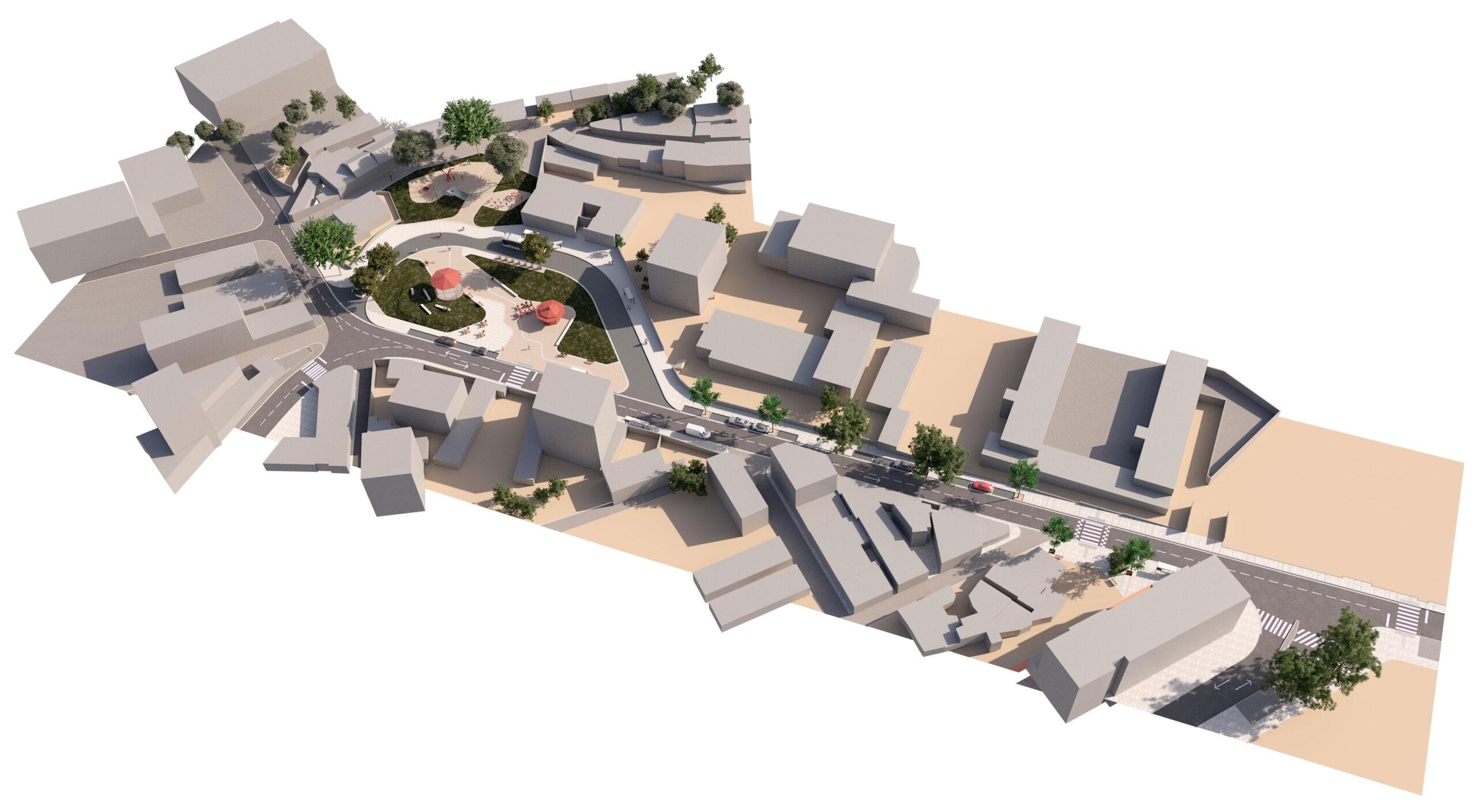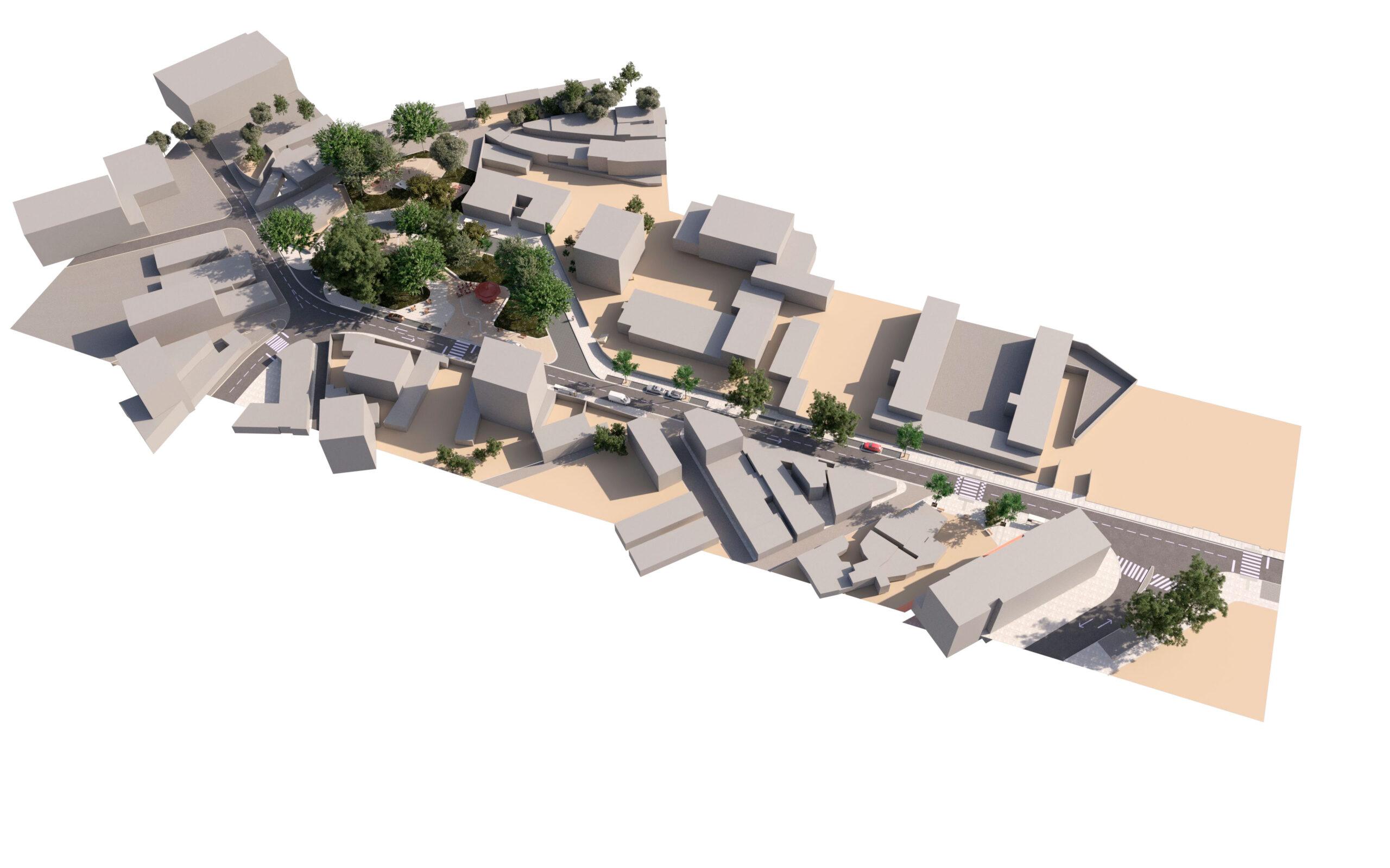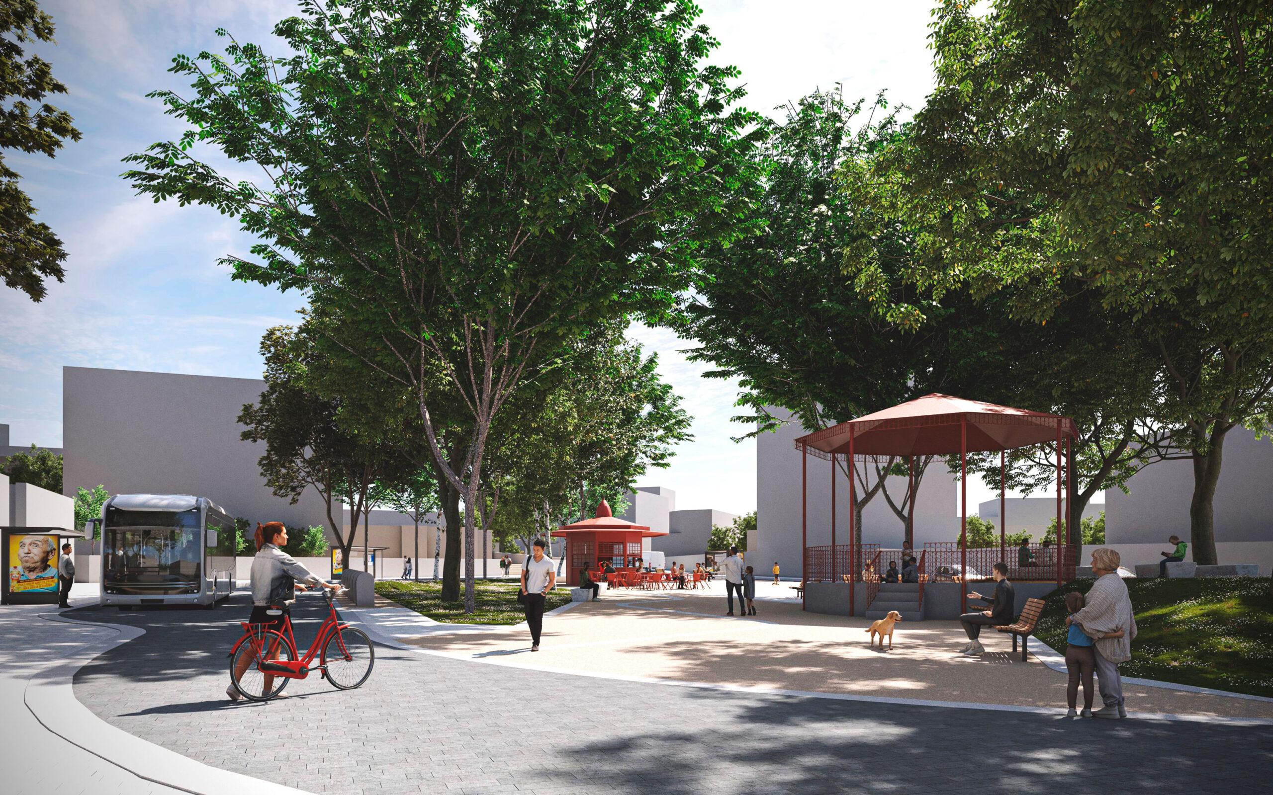 Na intervenção proposta, procurou-se diversificar a oferta de espaços exteriores, integrando várias valências no espaço público. Nesse sentido o projeto contemplou a criação de um largo que flexibilize o uso dos espaços exteriores, mantendo o coberto arbóreo e procurando ao mesmo tempo integrar a circulação dos veículos de transporte público que continuarão a utilizar o largo como ponto de terminal ou de interface.